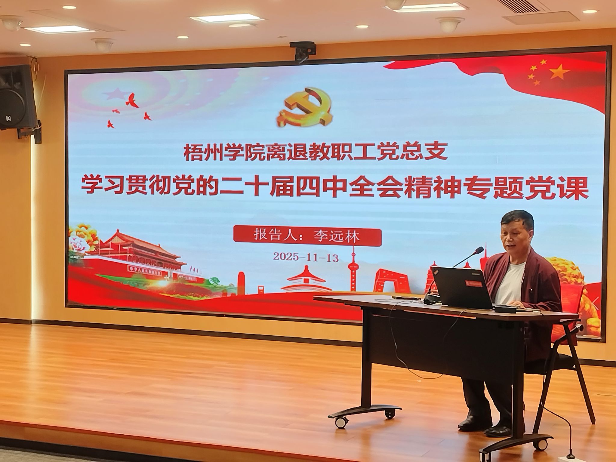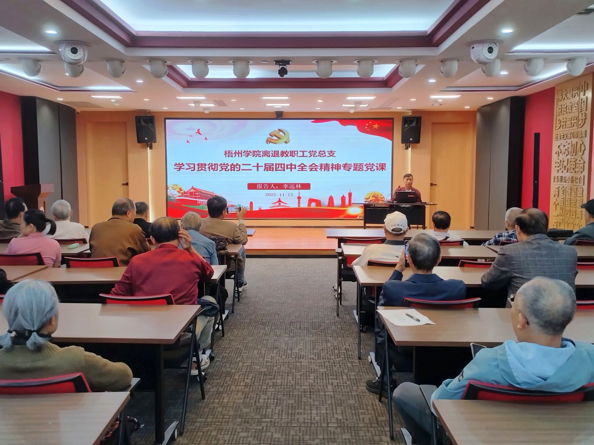 11 月 13 日下午,离退休教职工党总支在梧州市党群服务中心举办学习贯彻党的二十届四中全会精神专题党课,党总支副书记李远林主讲。