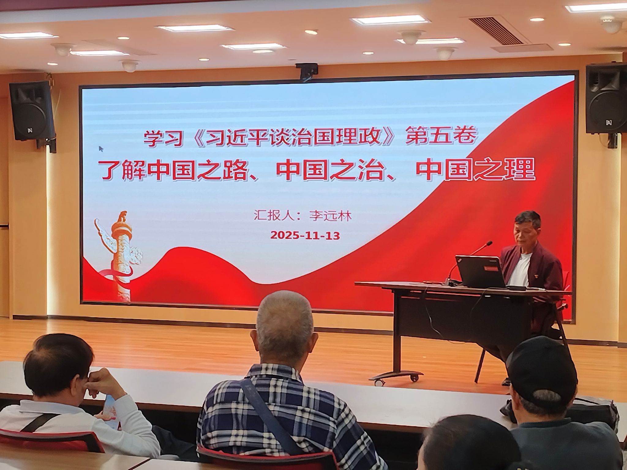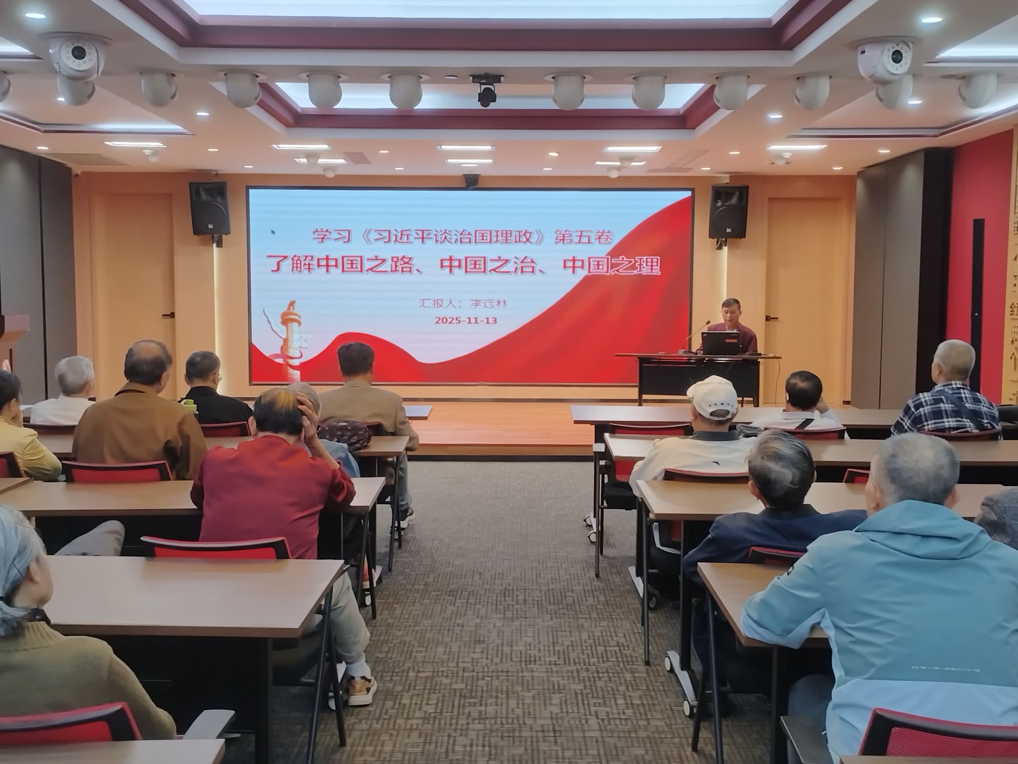 2025年11月13日,梧州市党群服务中心举办专题学习会,离退休党总支副书记李远林为总支四个支部的老党员解读《习近平谈治国理政》第五卷。