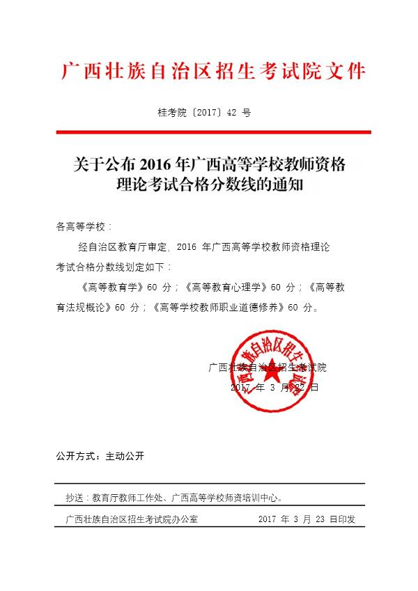 关于公布2016年广西高等学校教师资格理论考试合格分数线的通知